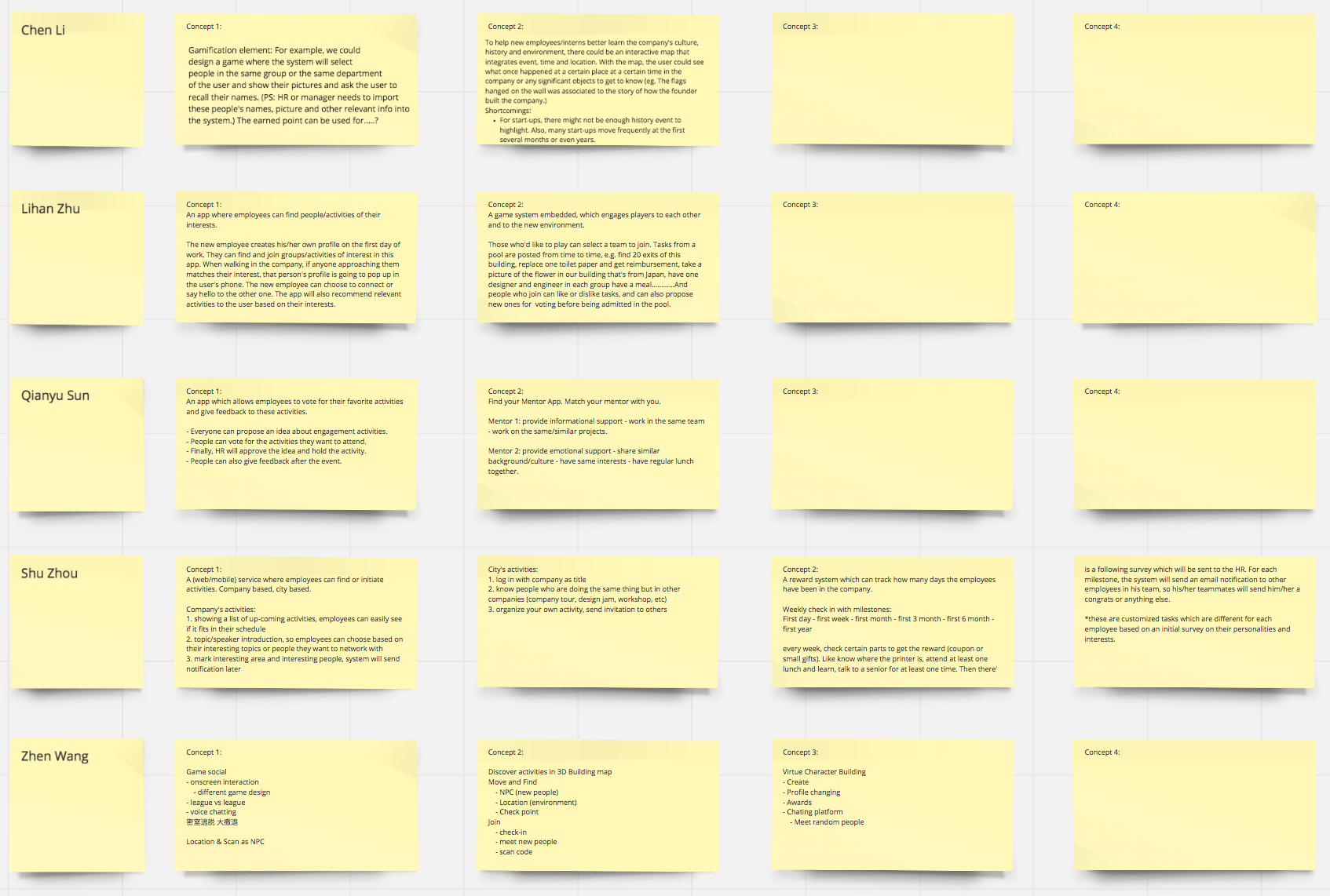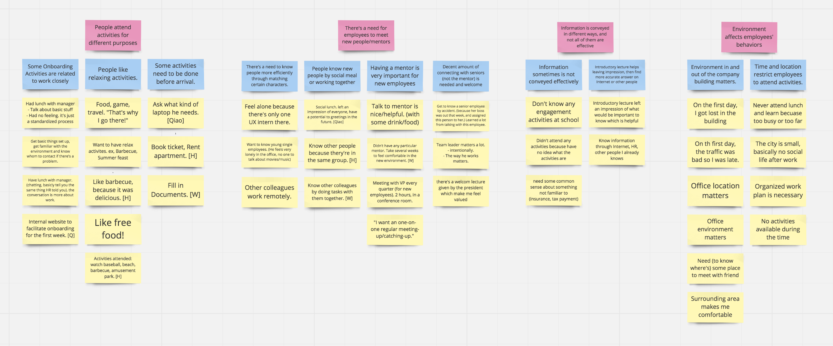 The target users are new employees who joined a company for less than 6 months. Each of us have talked to 1 to 2 people to conduct interviews, and utilised the interview notes to make an affinity wall to analyze and get insights.