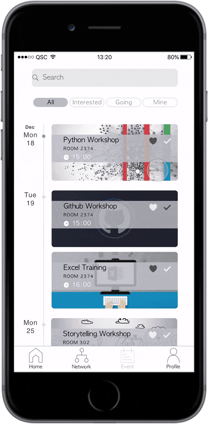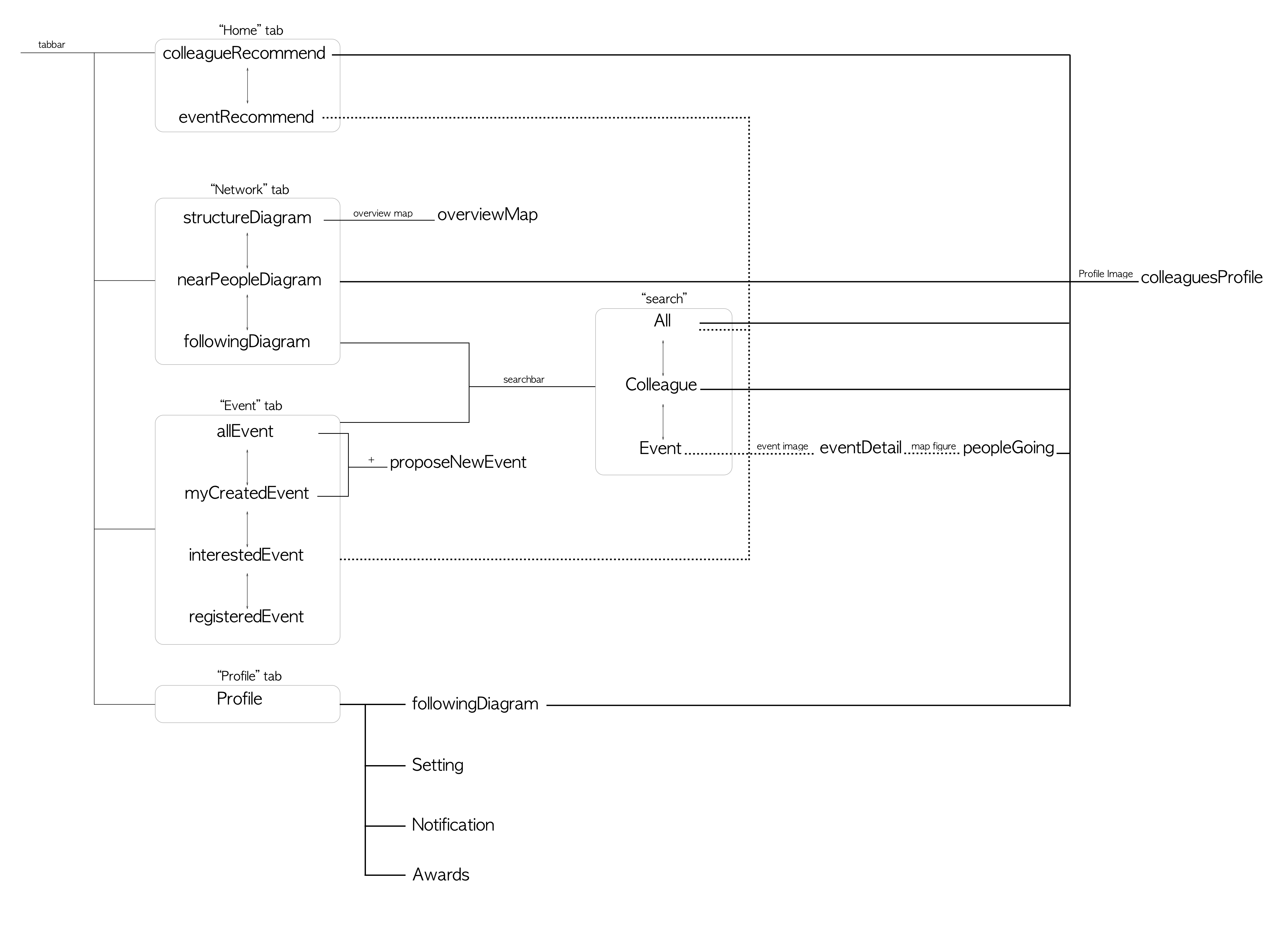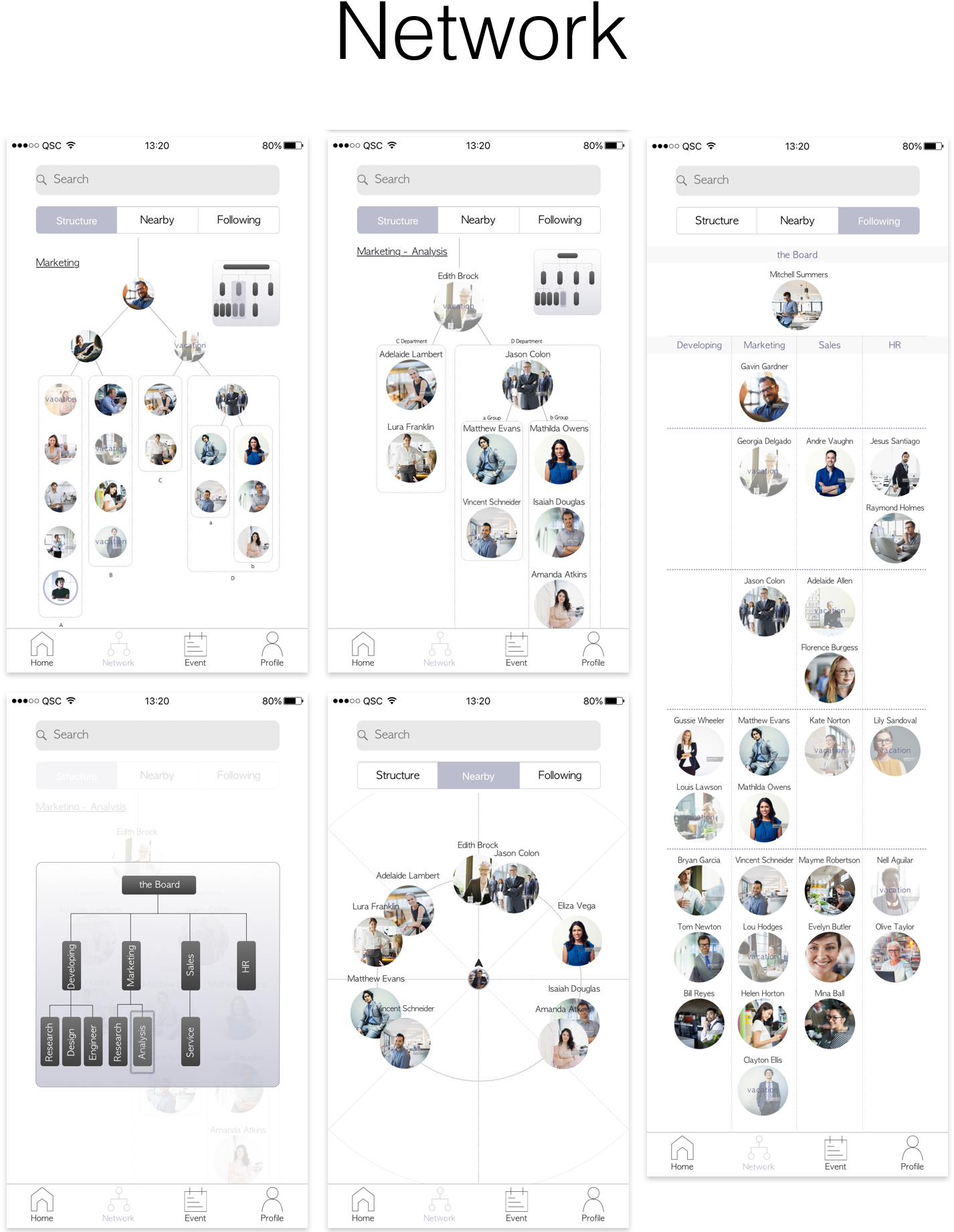 Network part can be connected with other parts(like profile, search, events) to enable a stronger function.