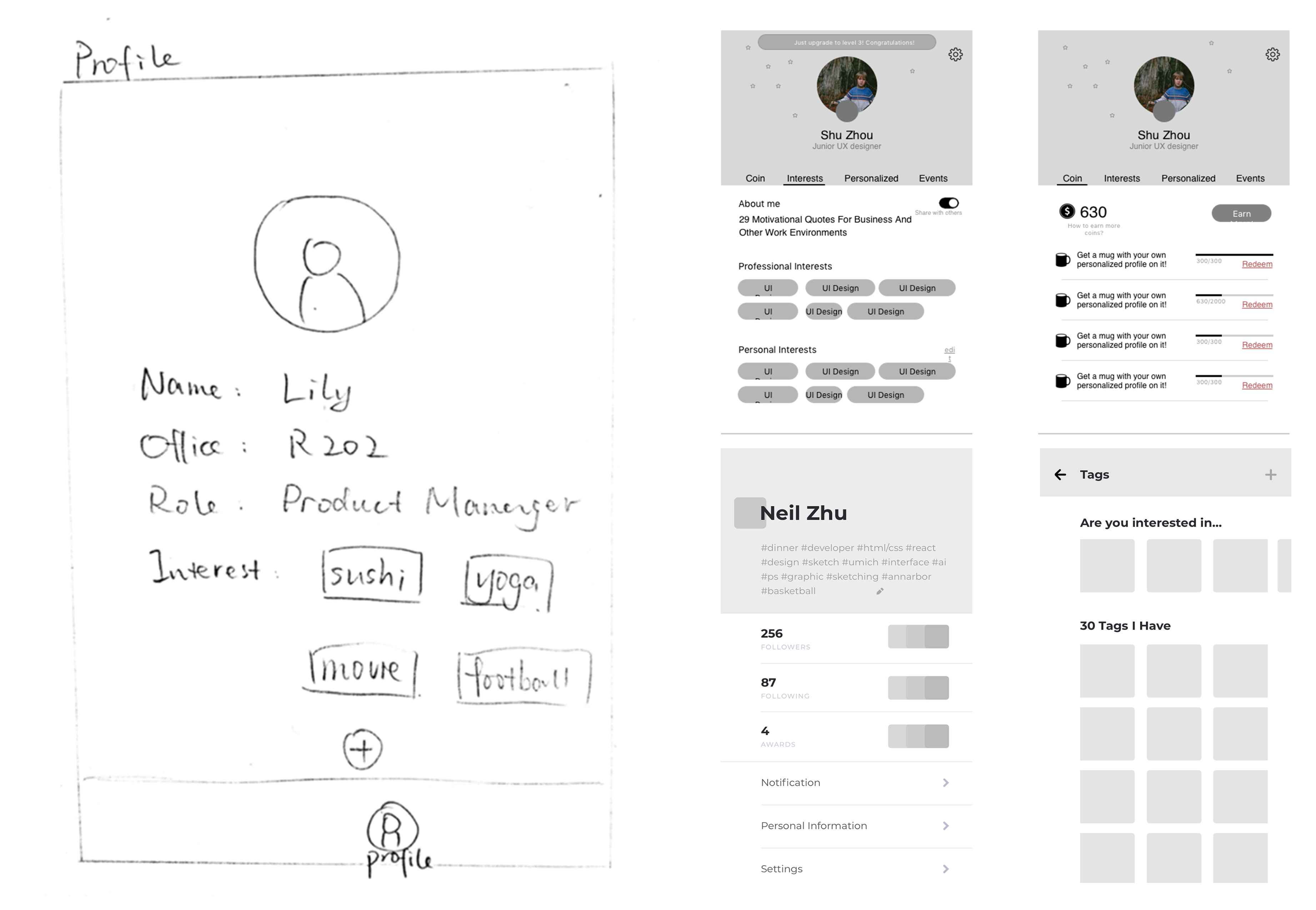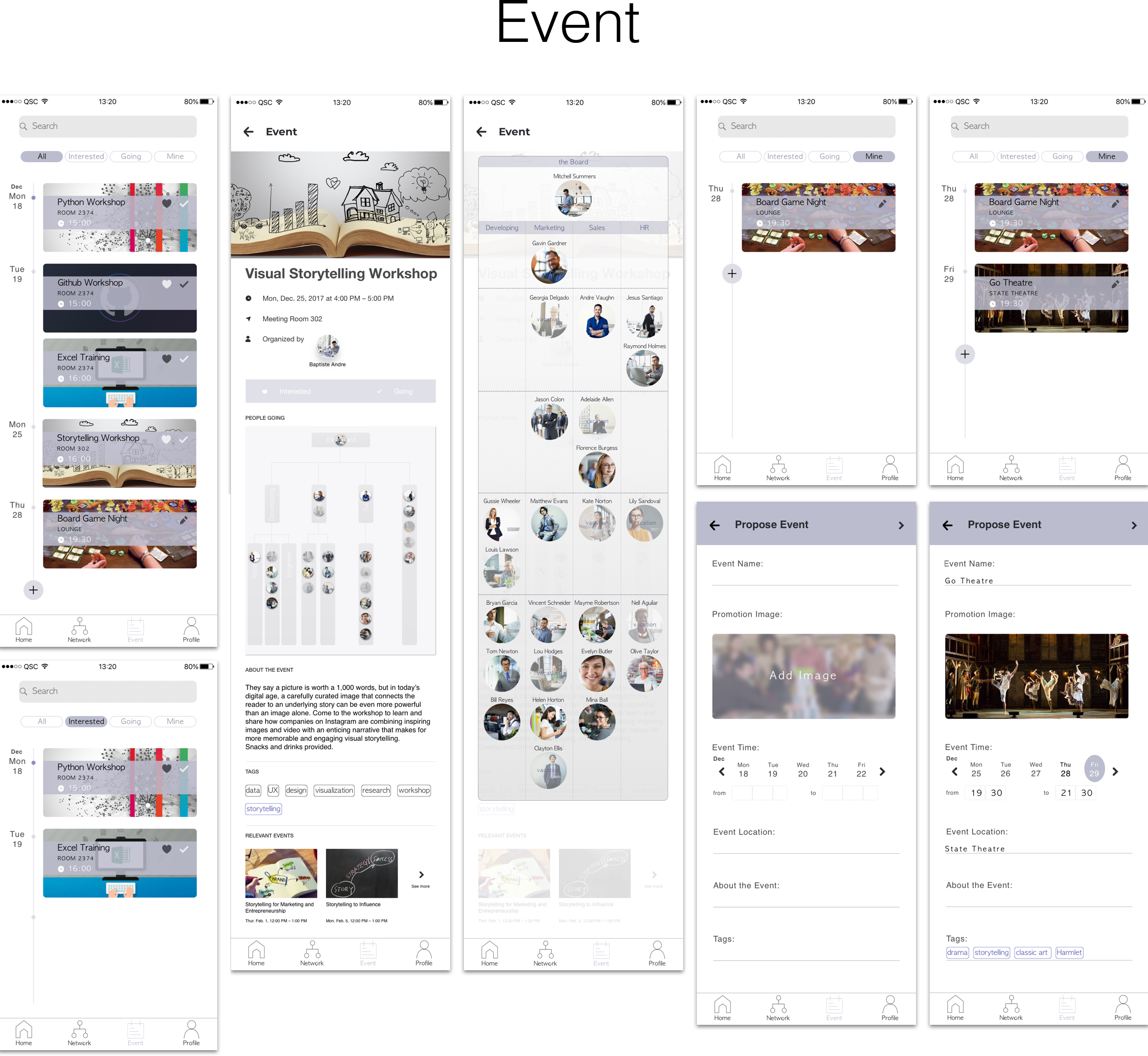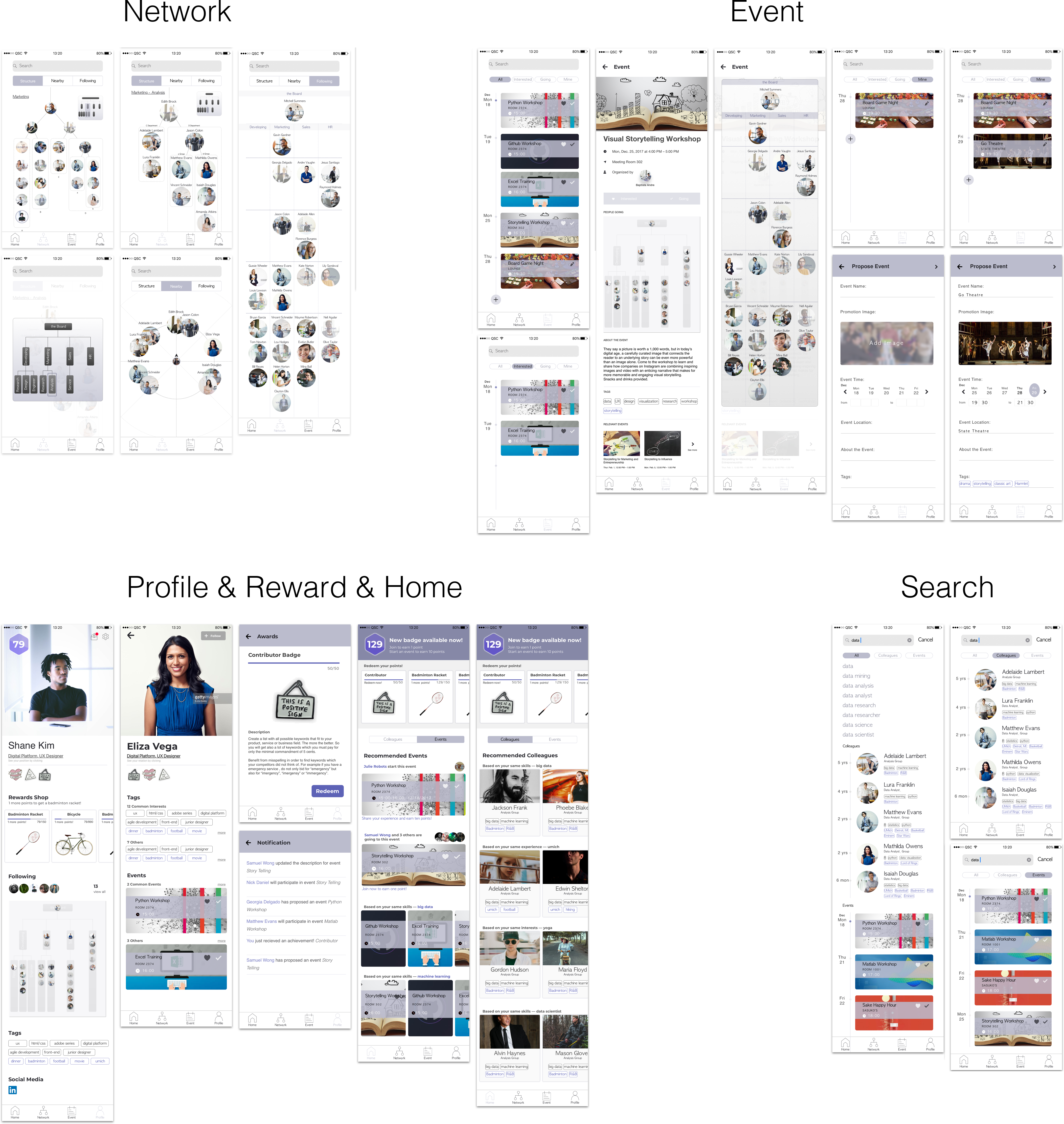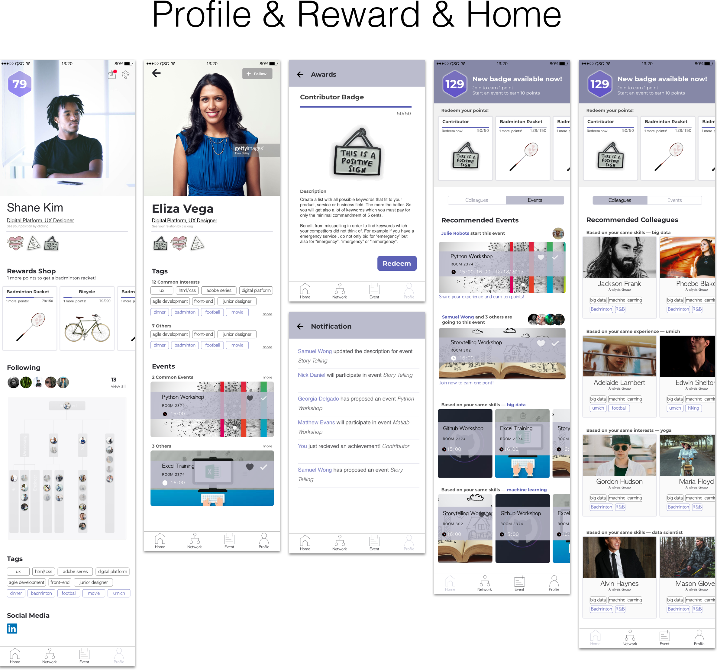 Then we have discussed and narrowed down to four basic features: Profile, Gamification, Network Illustration, and Event Platform. So firstly, we did some sketchy storyboards, below is part of them.