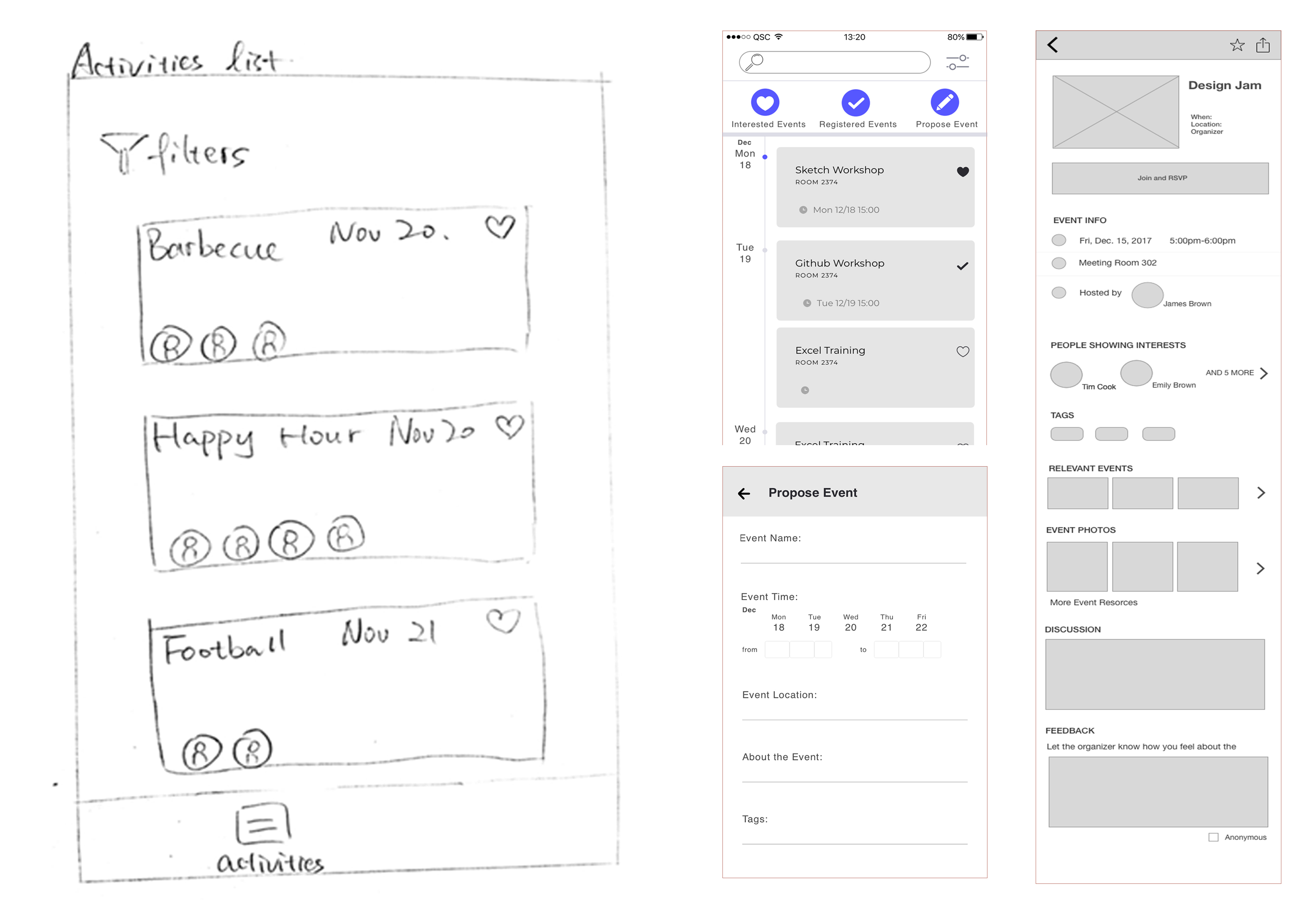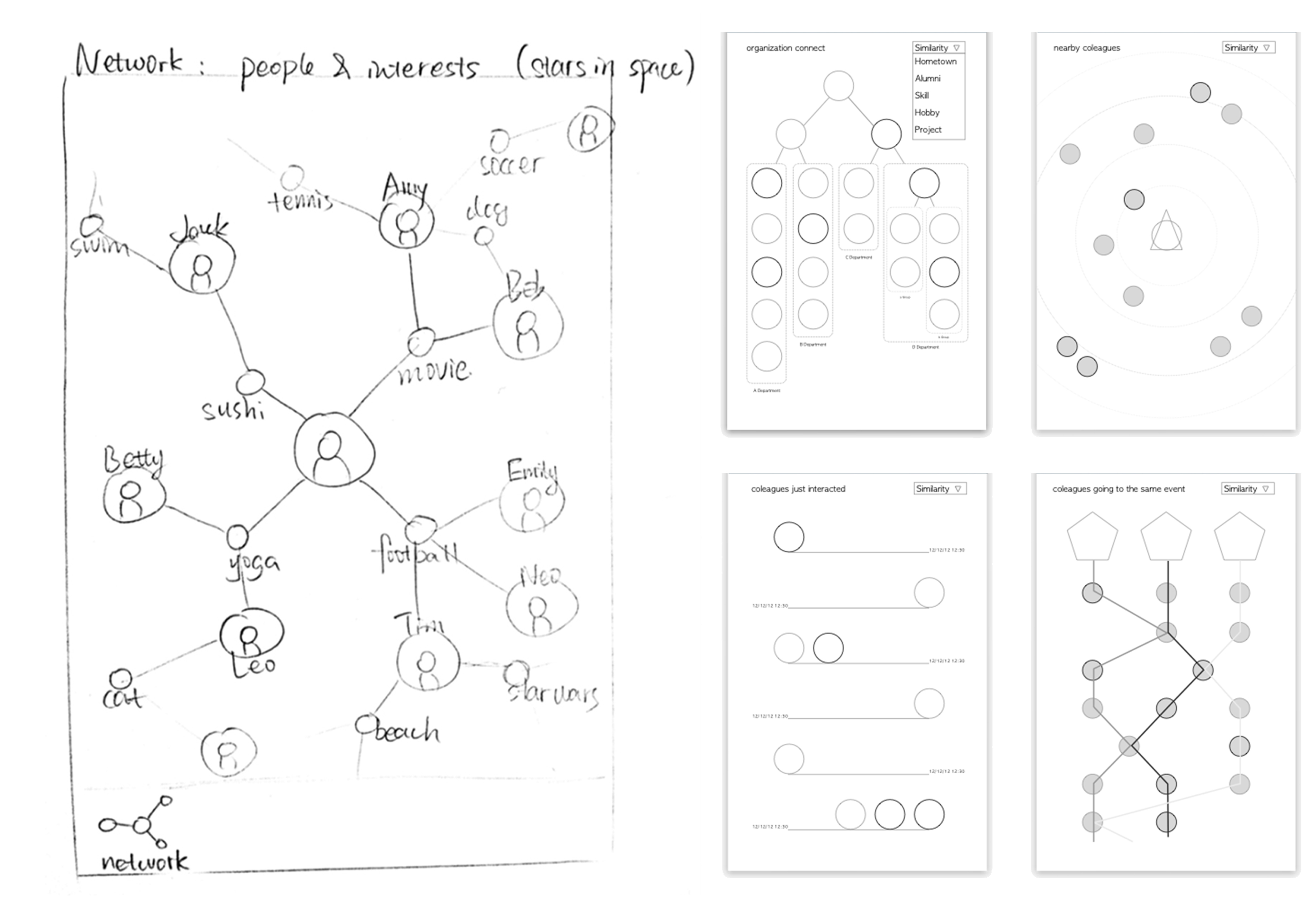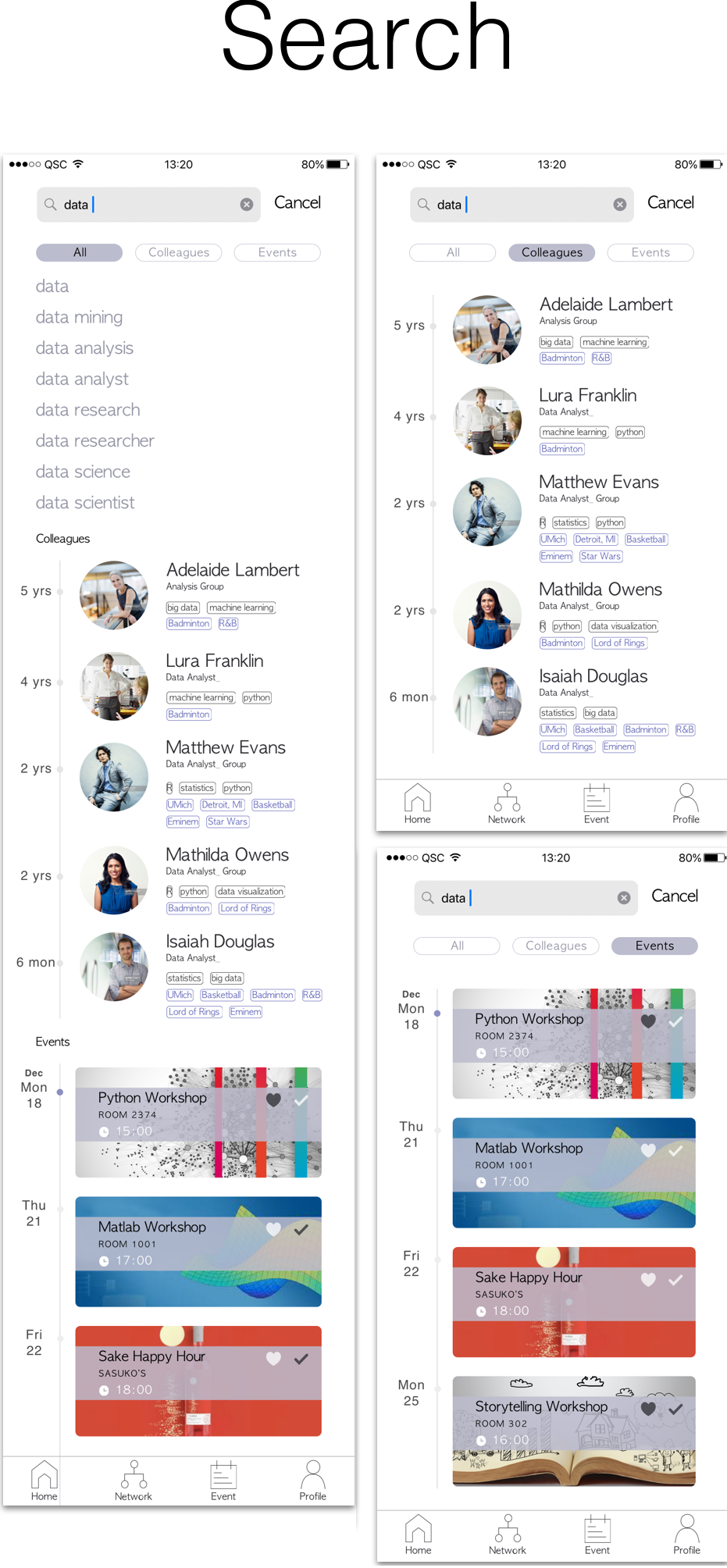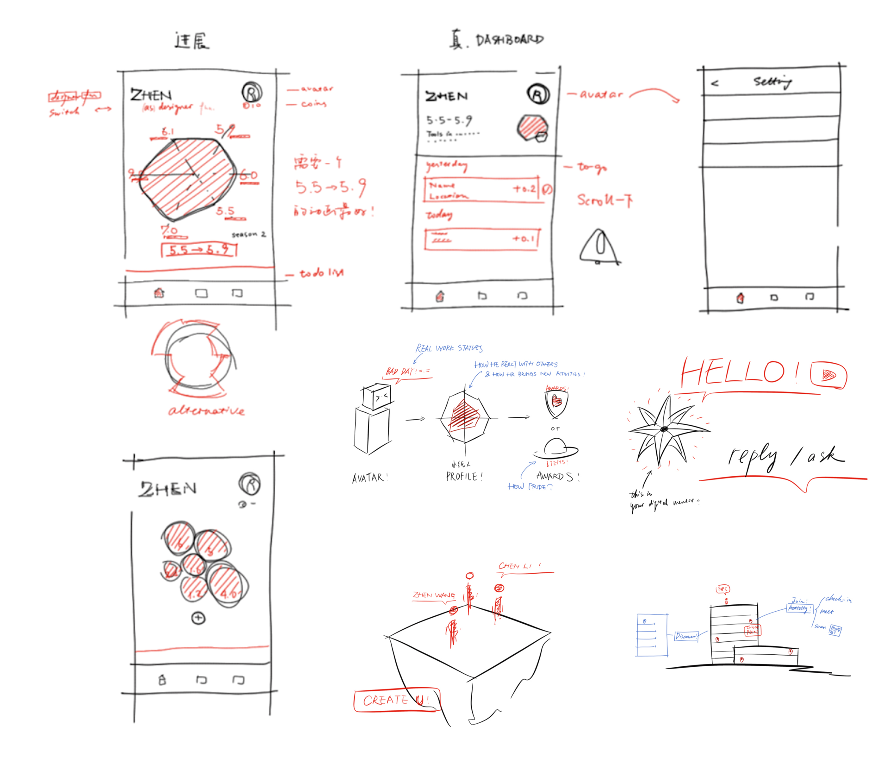 Then we have discussed and narrowed down to four basic features: Profile, Gamification, Network Illustration, and Event Platform. So firstly, we did some sketchy storyboards, below is part of them.