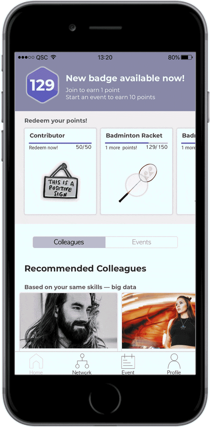 Gamification ---- The whole app is like a game. The more events employees propose or attend, the more progress he/she will make in the game.